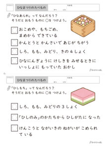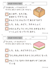 「ひなまつり」以外の行事にも興味が湧いていたら、季節の行事を集めたドリル(おはなし)で他の行事もチェックしてみましょう!