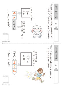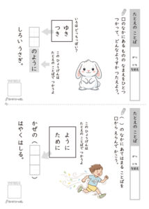 このプリントは、絵→選ぶ→自分で書くという3ステップで、無理なく「たとえる力」を育てられるよう設計しました。
