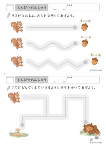 線を書けたときは、「リスさんがどんぐりに会いに行けたね」と物語として完了を喜ぶ声かけが、次の枠への意欲につながります。