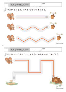 今回のプリントは「直線なぞり→直線迷路→曲線なぞり→点つなぎ」の順に、鉛筆を動かす複雑さが少しずつ上がるように設計しています。