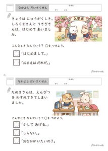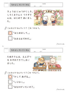 このプリントを使えば、場面ごとの「正解のパターン」を楽しみながら積み上げていくことができます。