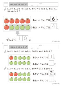 このプリントは、「10個のりんごを、あかいりんごとあおいりんごに分ける」という場面で、10の分解をくり返し練習できる構成になっています。