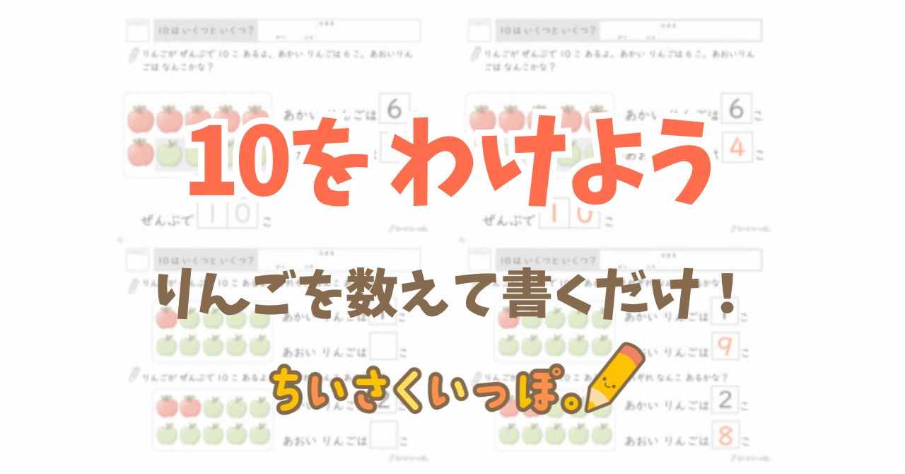 今回のプリントは、10個のりんごを「あかい りんご」と「あおい りんご」に分けて、10の合成・分解をくり返し練習できる内容になっています。数字だけでなく、目で見て数えられるりんごのイラストつきなので、数の概念がまだふわっとしているお子さんも取り組みやすくなっています。