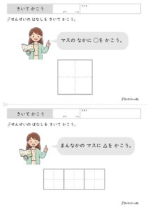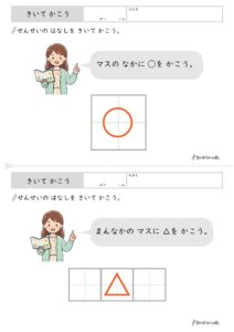 この「きいてかこう」プリントは、全部で3枚構成になっています。マスの中に指示通りの記号や形を書き込む、シンプルな問題が並んでいます。「まんなかのマスに◯をかこう」といった1指示の問題から、「みぎから2ばんめのマスに☆をかこう」といった複数の情報を含む問題へと、少しずつステップアップしていく内容です。