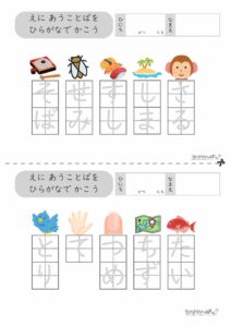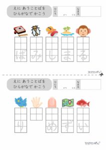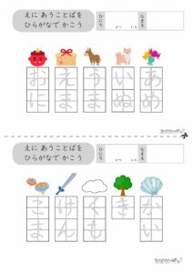本プリントは、絵を見て語を想起→音を分け→文字群を参考に→なぞる→清書という流れを一枚の中で完結できます。