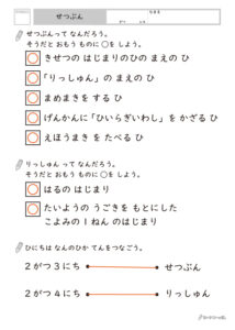 プリントには「りっしゅんのまえのひ」という言葉が出てきますが 、時間の流れが苦手なお子様にとって「前日」という概念は難しいものです。